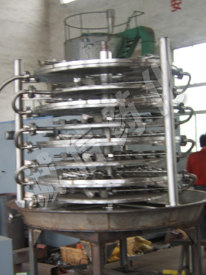 湿物料自加料器连续地加到干燥器上部第一层干燥盘上,带有耙叶的耙臂作回转运动使耙臂作回转运动使耙叶连续地翻抄物料。物料沿指数螺旋线流过干燥盘表面,在小干燥盘上的物料被移送到外缘,并在外缘落到下方的大干燥盘外缘,在大干盘上物料向里移动并从中间落料口落如下一层小干燥盘中。大小干燥盘上下交替排列,物料得以连续地流过整个干燥器。中空的干燥盘内通入加热介质,加热介质形式有饱和蒸汽、热水和导热油,加热介质由干燥盘的一端进入,从另一端导出。已干物料从^后一层干燥盘落到壳体的底层,^后被耙叶移送到出料口排出。湿份从物料中逸出,由设在顶盖上的排湿口排出,真空型盘式干燥器的湿气由设在顶盖上的真空泵口排出。从底层排出的干物料可直接包装。通过配加翅片加热器、溶剂回收冷凝器、袋式除尘器、干料返混机构、引风机等辅机,可提高其干燥的生产能力,干燥膏糊状和热敏性物 料,可方便地回收溶剂,并能进行热解和反应操作。