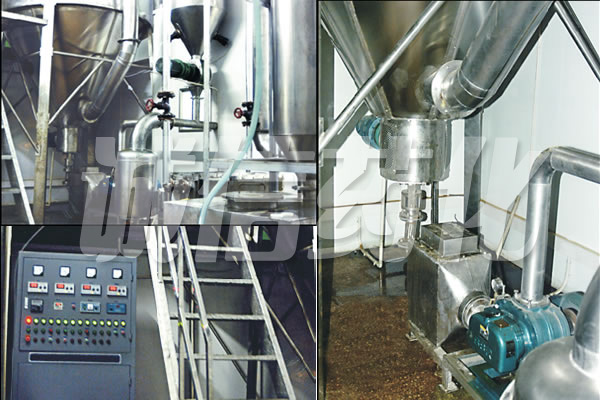 该机采用全封闭形式,所有部件均采用不锈钢制造,配有三级净化装置,过滤后的空气达十万级要求。筒体与顶部装有冷壁装置,使壁温<80℃,干燥塔内装有气刷扫塔装置。经该机干燥后的中药浸膏粉,不会出现焦化变质现象,大大增加了收粉率(95%以上),而且不会产生混药现象和粘壁现象。